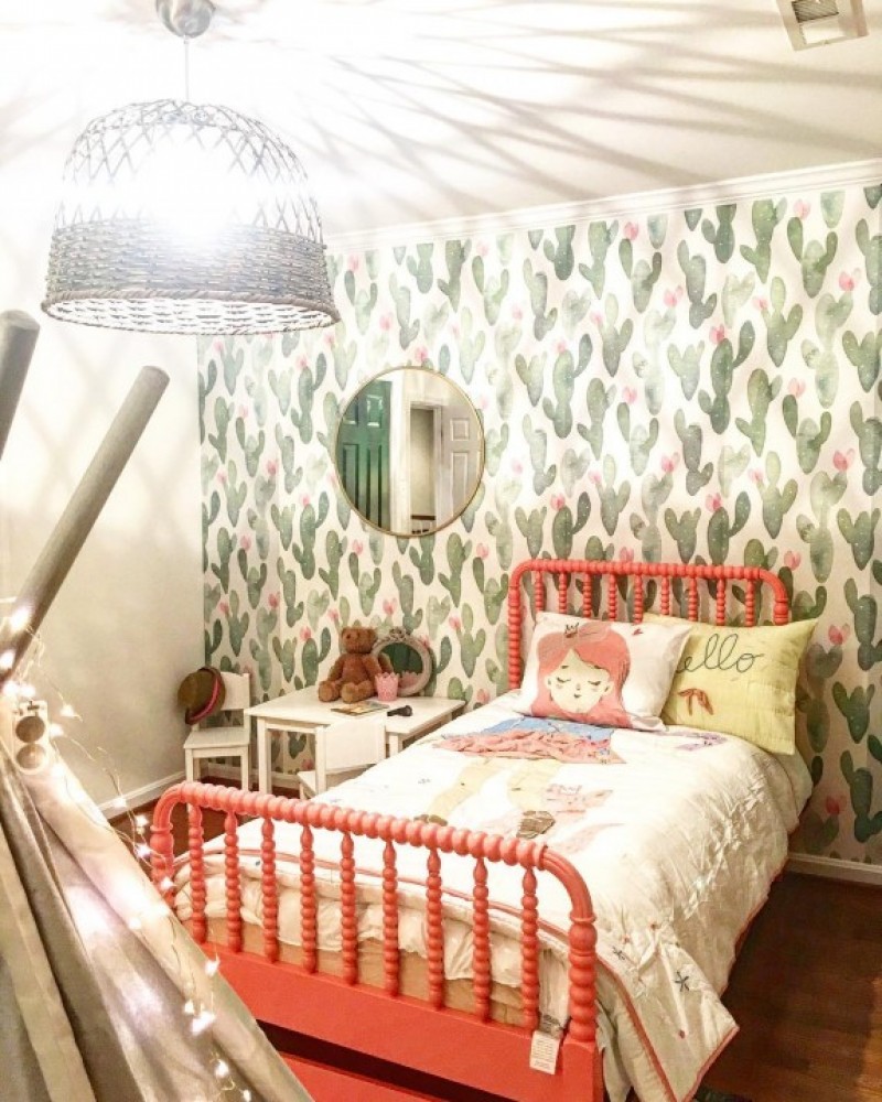 Les tendances cactus sont assez populaires cette année. Il est intéressant de placer des cactus partout : sur le rebord de la fenêtre, les étagères, et même sur le mur. Pour cette pièce, le papier peint amovible Cactus Sans Épines avec un motif pastel est une idée parfaite. Il met en valeur un mur de manière intéressante, sans alourdir la pièce, et la teinte naturelle de vert avec de petites touches de rose est une combinaison élégante qui se rapproche de la nature. Un papier peint pastel comme celui-ci est une idée parfaite.