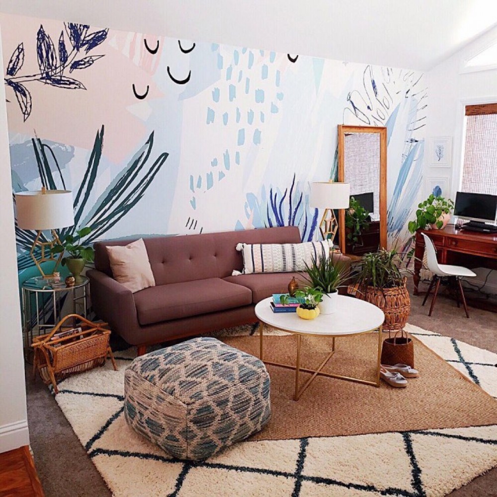Des décorations abstraites et des nuances pastel – ce magnifique fond pour le salon a été créé par le papier peint autocollant Tropical Abstraction En combinaison avec des couleurs naturelles et des plantes, nous obtenons une composition intéressante. Bien que le motif abstrait du papier peint pastel amovible soit assez coloré, il reste discret et n'étouffe pas l'espace. Comme on le voit, il est possible de combiner un amour pour les couleurs avec un style de décoration sobre.