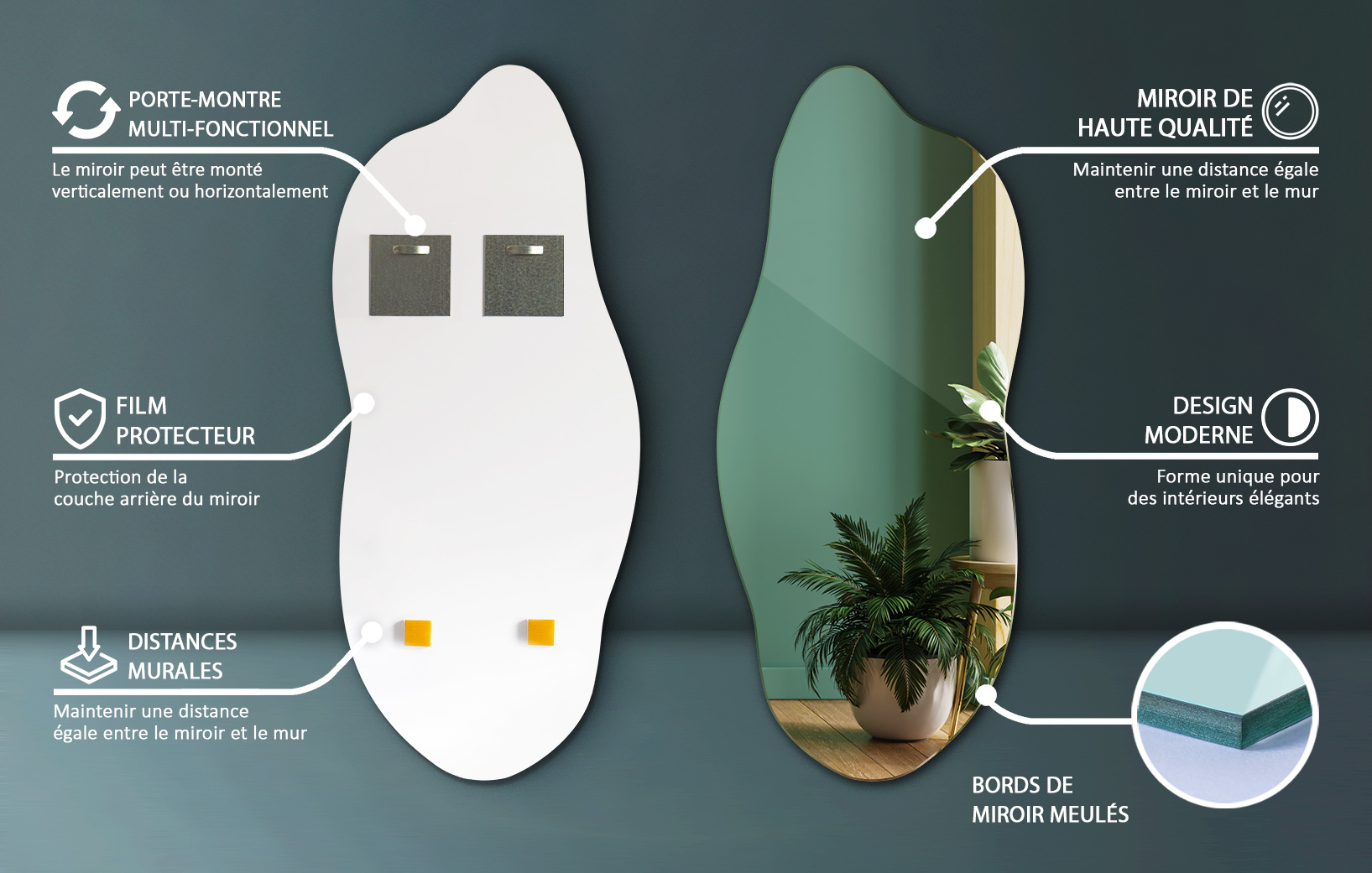 Le Miroir irregulier raffiné est une pièce décorative unique qui apporte modernité et raffinement à votre intérieur. Sa forme organique rompt avec les lignes classiques et ajoute une touche artistique à vos espaces, tout en agrandissant visuellement la pièce.